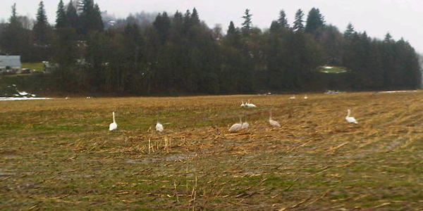 This weekend I had a special treat because the swans arrived for the second time this season. I think the unseasonable weather might be confusing them but whatever the reason I was happy to see them poking around a neighbour’s field hunting down the corn left over after harvest. When I stopped to take this picture, they were honking in complaint, and two of the pure white ones quickly herded several gray ones (nearly grown babies I assume) away from our car. “Hey, junior, get away from those big birds. I don’t like the sound of their honk.”