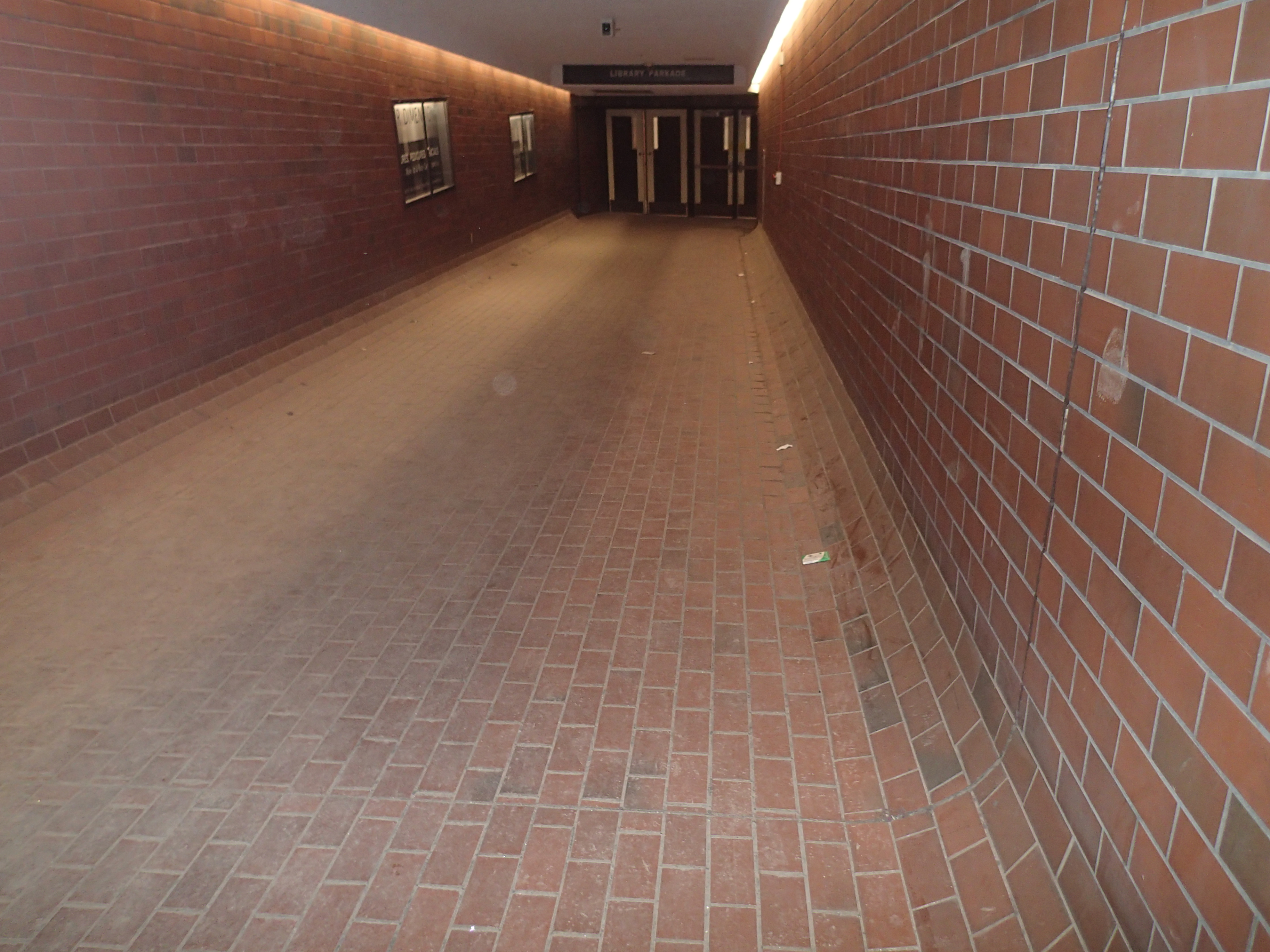 Following his instructions I walked into a chilly brick-lined hall. The empty walkway sloped down to a set of industrial doors. It was lonely, poorly lit and ominous. No one leaped out at me so I proceeded, finding myself in an equally creepy parking lot (low ceilings and nasty air that would have made running away from a killer challenging). My full journey had me travel through stairwells and hallways, a parking lot, a theatre and then finally into the office building I was looking for. By the time I arrived the writer in me had devised a whole scene of me being pursued by a man in a mask. The death scene in my slasher flick would have been on the stairs of the theatre, with a view of the snow outside providing a great contrast for the blood as it splattered against the windows.