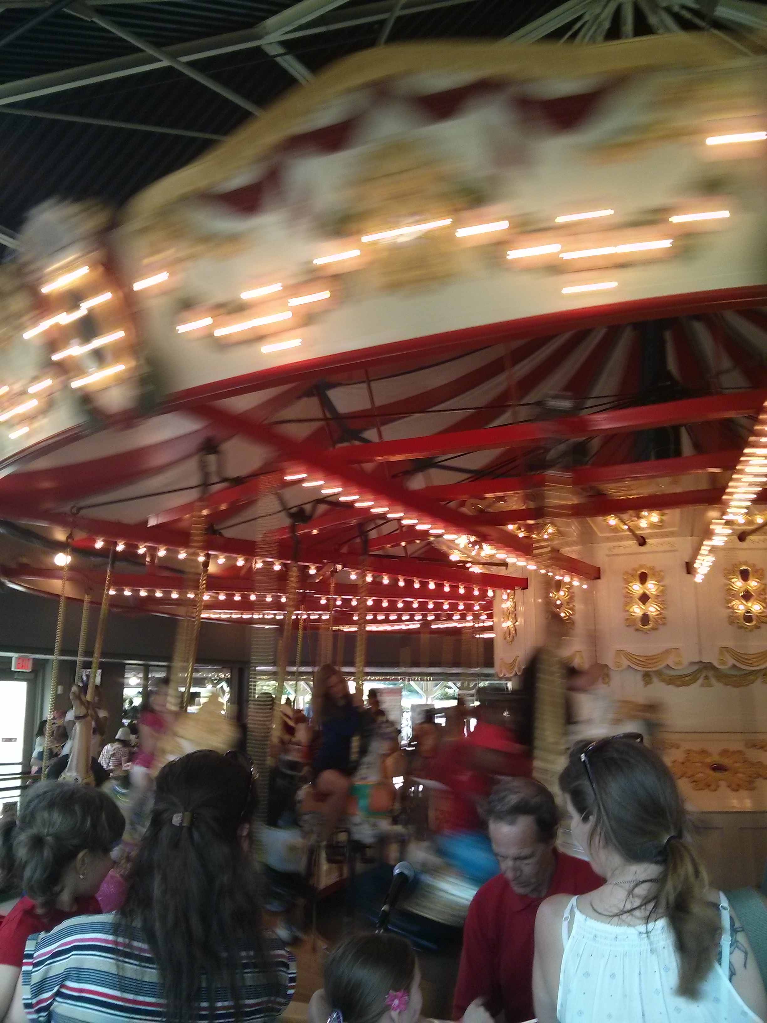I chose a steed (well really by virtue of the standing-politely-in-line-until-something-was-available system it chose me) and mounted (celebrating, when I achieved my seat, that I didn’t have to put up my hand and ask for help). Then, once we were all aloft, the music began and we went round and around at speeds that seemed much too fun to be considered safe by modern standards.